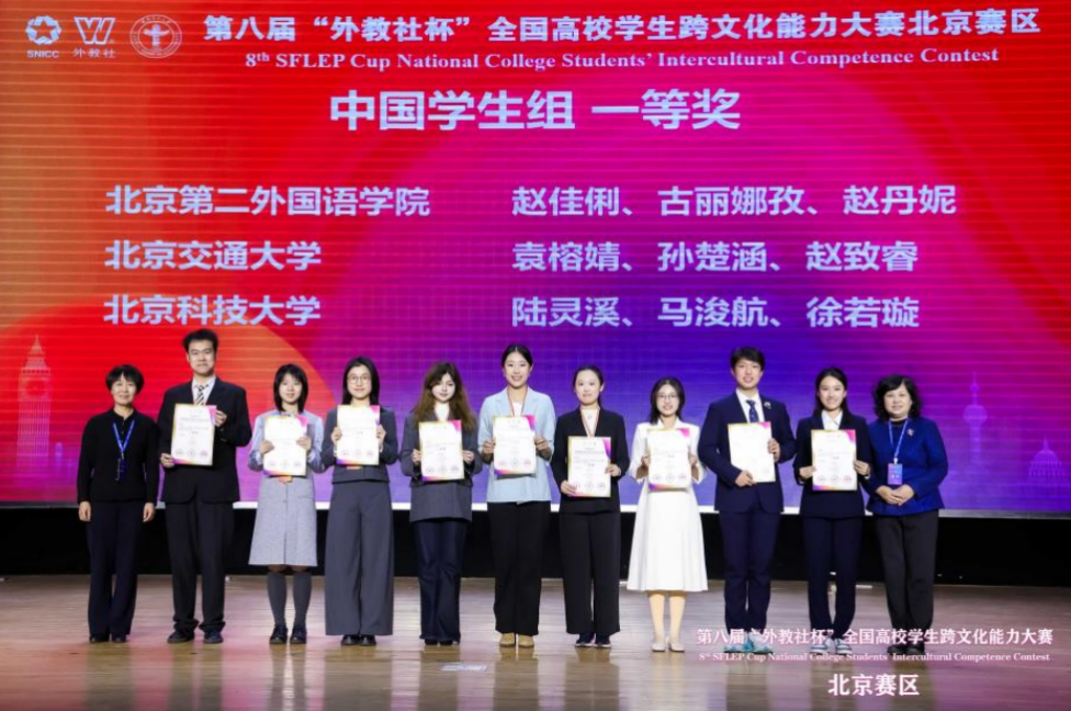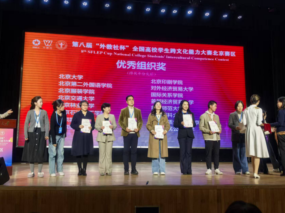 From November 1 to 2, 2025, the Beijing Regional Finals of the 8th SFLEP Cup National College Students’ Intercultural Competence Contest was held at Capital Medical University. The team selected by the Public English Teaching Department of the School of Languages and Communication Studies at our University stood out among 38 competing teams, winning the First Prize in the Chinese Students (English) category. This marks the best performance in our University's history of participating in this contest, and our University was also awarded the "Outstanding Organization Award".