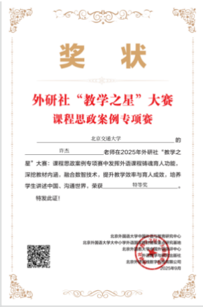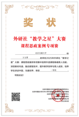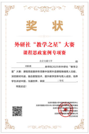 The results of the 2025 "Teaching Star Competition" hosted by Foreign Language Teaching and Research Press were recently announced. Delegation from the Department of English Language Teaching, Beijing Jiaotong University achieved outstanding results in the national event, securing multiple awards. It was attributed to their solid professional expertise, innovative teaching philosophies, and remarkable outcomes in courses with ideological-political elements. This not only showcases the overall strength and teaching vitality of our English faculty, but also exemplifies the University's continuous efforts to promote public English teaching reform, deepen the development of courses with ideological-political elements, and implement the fundamental task of fostering virtue and cultivating talents.