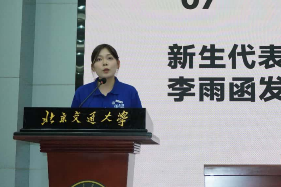 Li Yuhan, a representative of undergraduate freshmen, shared her plans for exploring and growing during her college years, drawing on her military training experience and her initial impressions of Beijing Jiaotong University. She stated that she would continuously refine her language communication skills, embody the school motto of "Learn and Practice" over the next four years, and grow into a young person with Chinese sentiment and a global perspective.