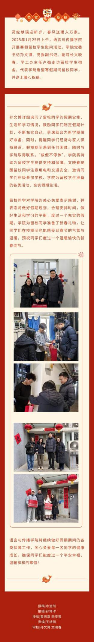 The auspicious snake brings good omens to welcome the new year, and the spring breeze sends warmth to thousands of families. On the morning of January 25, 2025, The School of Languages and Communication Studies carried out a condolence activity for students staying on campus during the winter vacation. Sun Wenbo, Secretary of the Party Committee of the School, Wen Yingchun, Deputy Secretary of the Party Committee and Vice Dean, and Lu Qiang, Director of the Student Affairs Office, visited the dormitories of students staying on campus, represented the school to visit the students staying during the winter vacation, and sent them warm wishes.