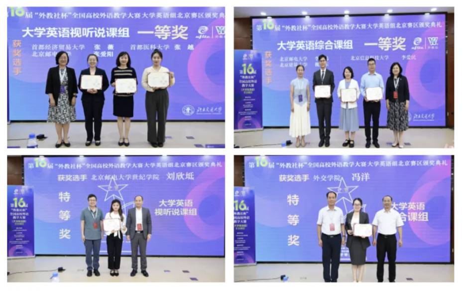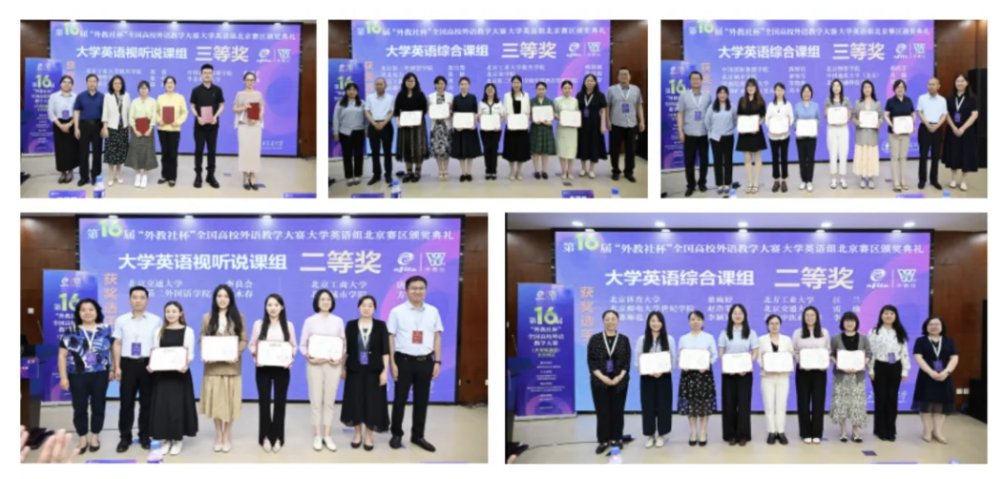 The award ceremony took place on the afternoon of June 8. Distinguished guests included Professor Li Guoxiu, Vice President of Beijing Jiaotong University; Mr. Xian Lianping, President of the Beijing Association of Higher Education and former Director of the Beijing Municipal Education Commission; Mr. Li Jingtao, Director of the Higher Education Department of the Beijing Municipal Education Commission; Mr. Ye Qing, Deputy Editor-in-Chief of Shanghai Foreign Language Education Press and Deputy Secretary-General of the National Organizing Committee of the Contest; Professor Li Shujing, Secretary of the CPC Committee of the School of Foreign Languages, Peking University, member of the College English Teaching Steering Committee of the Ministry of Education, and Chair of the College English Research Branch of the Beijing Higher Education Society; Professor Zhang Xihua, Standing Committee Member of the CPC Committee, Head of the United Front Work Department, and Director of the Academic Affairs Office of Beijing International Studies University; as well as deans and experts from over ten universities, including China University of Political Science and Law, Communication University of China, China University of Geosciences (Beijing), China University of Mining and Technology (Beijing), People's Public Security University of China, North China Electric Power University, Beijing Forestry University, Beijing University of Posts and Telecommunications, Capital Normal University, Capital Medical University, Capital University of Economics and Business, Beijing Information Science and Technology University, Beijing Wuzi University, and Beijing Institute of Graphic Communication.
